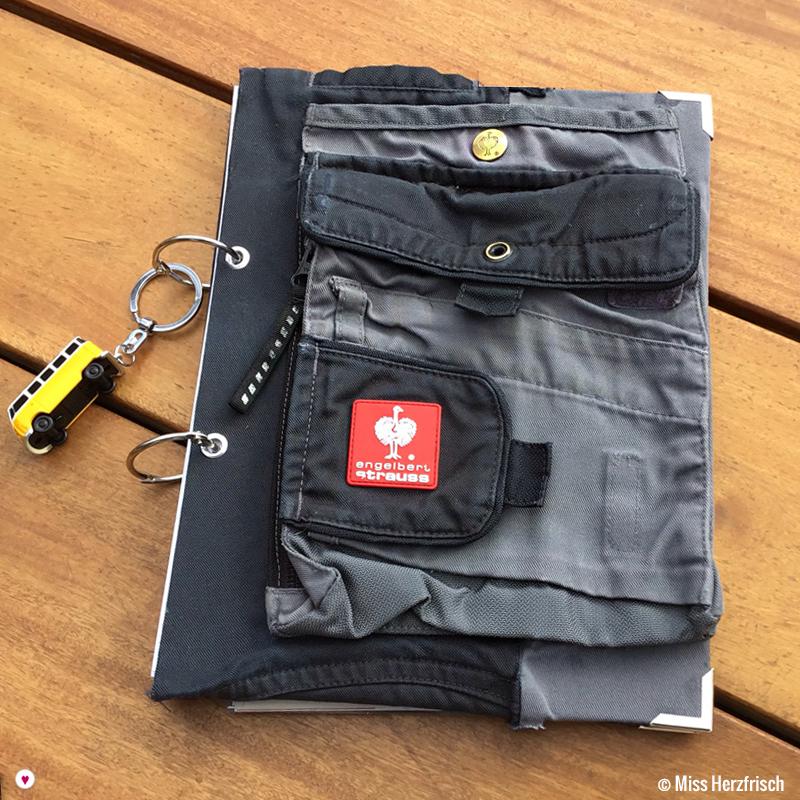 Also habe ich ein Skizzenbuch für ihn gemacht und die Cover mit einem Stück aus einer alten Arbeitshose bezogen: mit einer großem Tasche mit ganz viel Platz für seine Stifte und alles was kleine Handwerker so dabeihaben müssen.