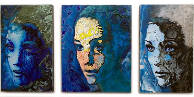 Dieses drei Bilder haben mich schon aus weiter Entfernung magisch angezogen. Sowohl die Augen der Frauen, wie auch die Kombination der kräftigen verschiedenen Blautöne ziehen den Blick auf sich und dann man taucht ganz automatisch ein. Bei näherem Hinsehen entdeckt man die verschiedenen Oberflächenstrukturen, der Untergrund ist eine Landkarte und darauf grobe und feine Oberflächen.