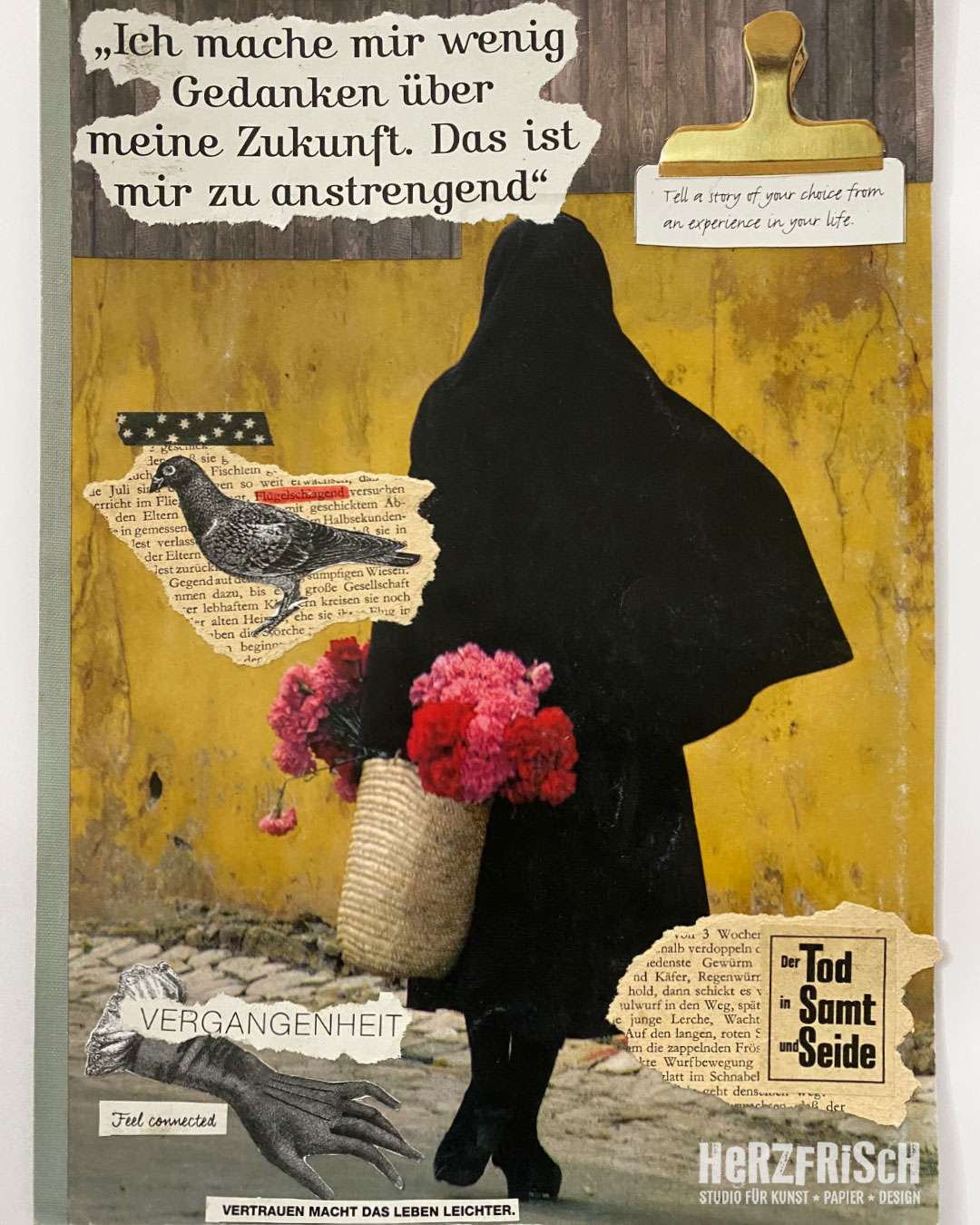 Die Collagen, die dabei entstanden sind, sind so vielfältig wie die Menschen am Tisch: verspielt, nachdenklich, bunt, humorvoll und manchmal auch ein bisschen rebellisch. Jede Collage erzählt ihre eigene kleine Geschichte.