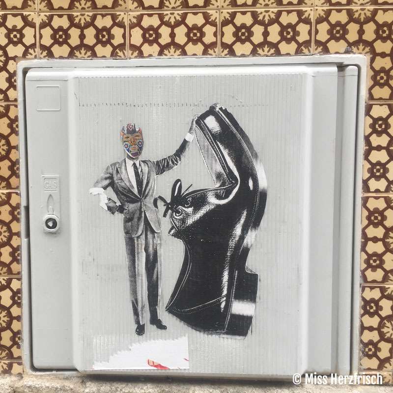 Viele Streetart Collagen stammen von der Künstlerin Coração o Ditador … mir gefällt der Gedanke, statt auf Papier Kunst direkt auf Häuserwände zu kleben sozusagen als Freiluft Galerie, um sich bekannt zu machen… ihr Stil gefällt mir sehr … Collagen im surrealistischen Stil :)
