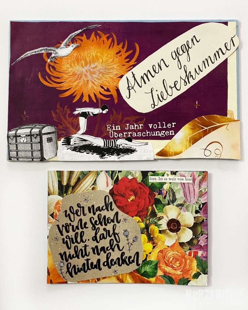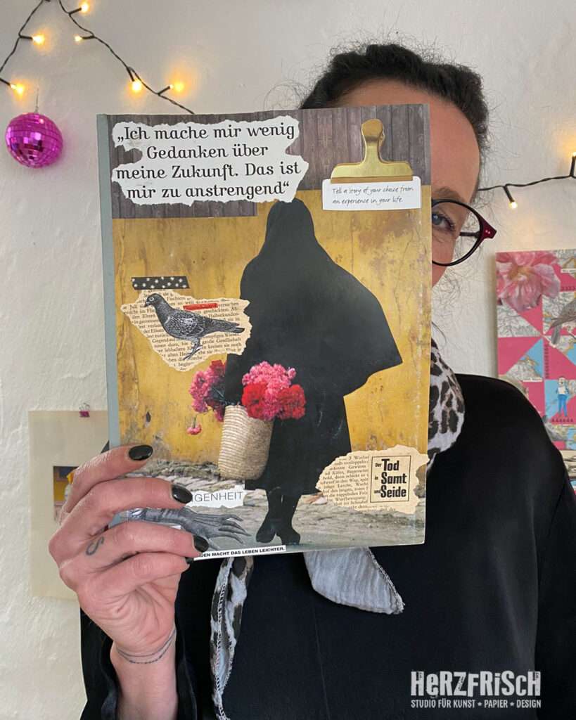 Die Collagen, die dabei entstanden sind, sind so vielfältig wie die Menschen am Tisch: verspielt, nachdenklich, bunt, humorvoll und manchmal auch ein bisschen rebellisch. Jede Collage erzählt ihre eigene kleine Geschichte.