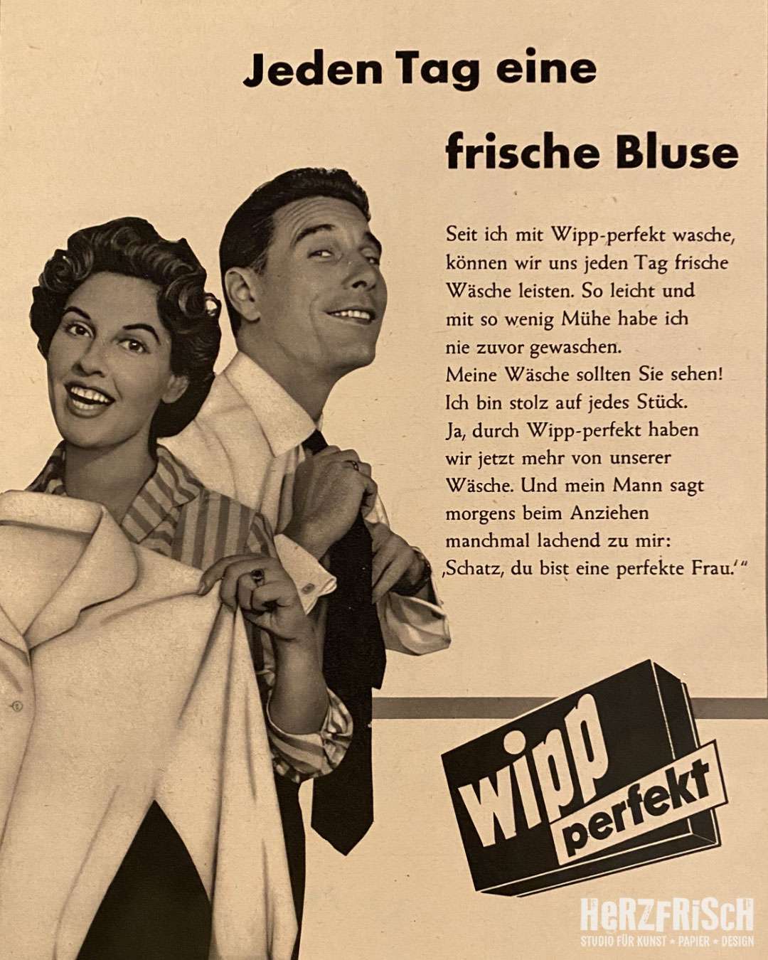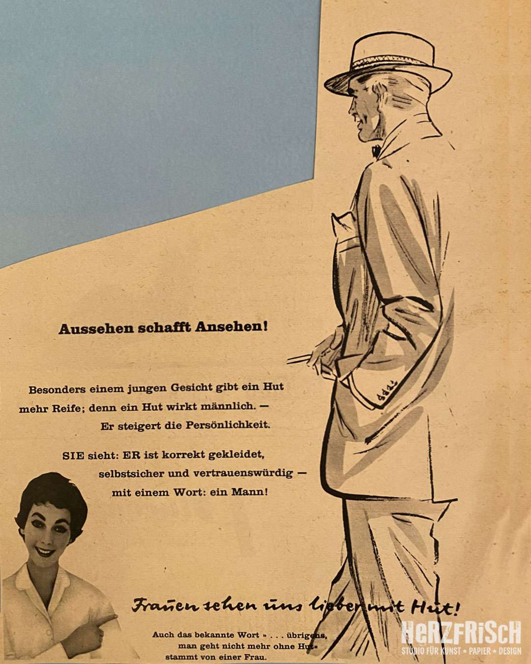 Hier zeige ich euch einige der entstandenen Collagen – und ein paar der herrlich skurrilen Anzeigen aus den 50er-Jahren, die uns immer wieder zum Lachen gebracht haben.