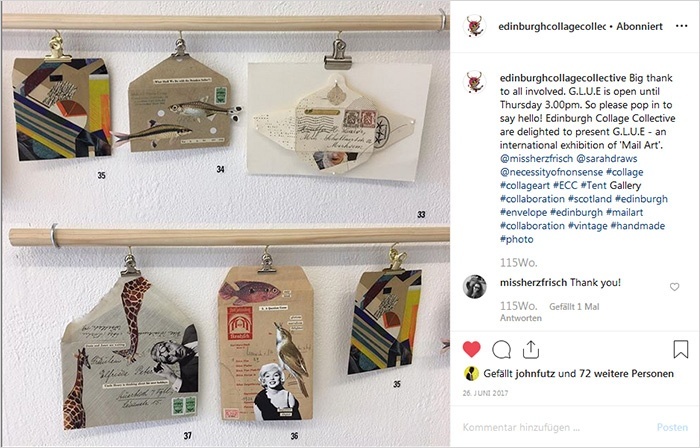I am very proud that my fish collage envelope were invited to present in ECCs‘ G.L.U.E Exhibition – an international exhibition of ‚Mail Art‘ in Edinburgh. The Edinburgh Collage Collective (ECC) organized the exihition and so my envelopes are shown together with over 130 submissions from as far as Australia, Canada, Los Angeles and Peru at the moment .