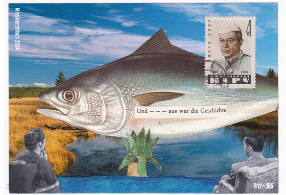 Postkartengruß Nr. 24 „Gute Reise * Have a good trip“Aus irgendeinem Grund faszinieren und inspirieren mich die Fische und deshalb schmuggeln sie sich wohl auch immer wieder in meine Collagen.