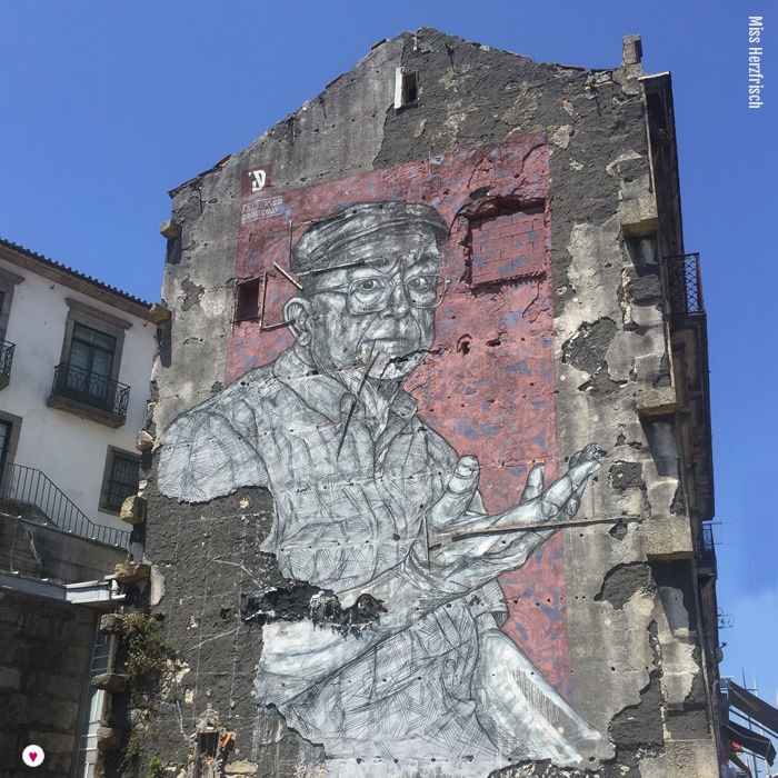 Auf unserer Tour wurden wir von Sonnenschein und diesem tollen Portrait von Frederico Draws an der Ponte Dom Luís I empfangen. Sehr einladend der Titel „Anfitrião“, (port. Gastgeber), um direkt auf Entdeckungsreise nach weiteren Streetart zu gehen.