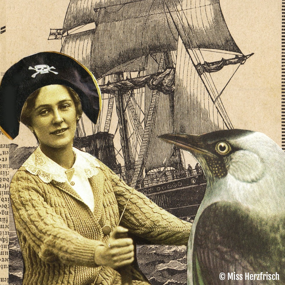 Für meine Collagen verwende ich verschiedenste Materialien aus meiner Sammlung: Postkarten, Vintage Kinderbücher, Modeprospekte, Schnittmuster, Magazine, Atlanten, Landkarten, Lexika, Papiere, Vintage Fotos, Aufkleber, Servietten, Masking Tape, Glanzbilder, Spielkarten, Briefmarken, Schallplattencover, Notenblätter, Ephemera, Illustrationen, Rubbelbuchstaben, Acrylfarben …