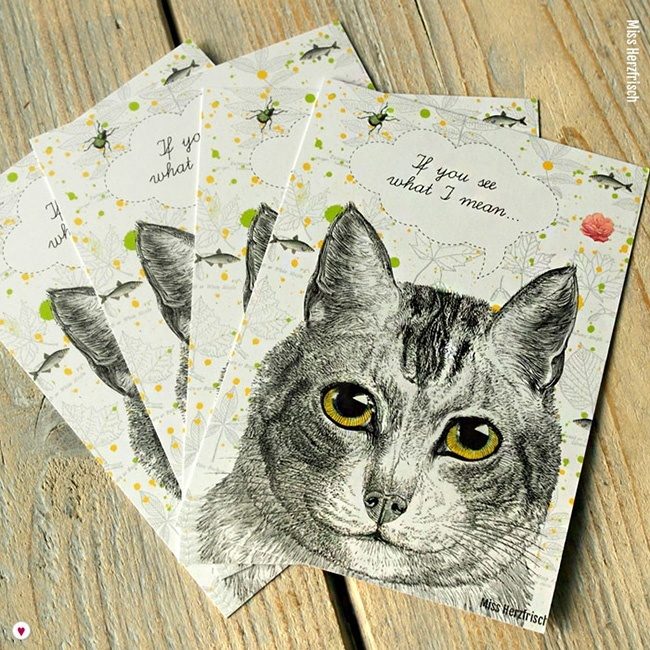 Ein herzfrischer Katzen Postkartengruß „If you see what I mean“.