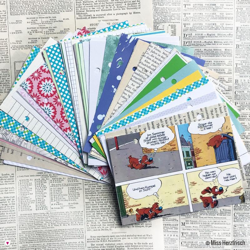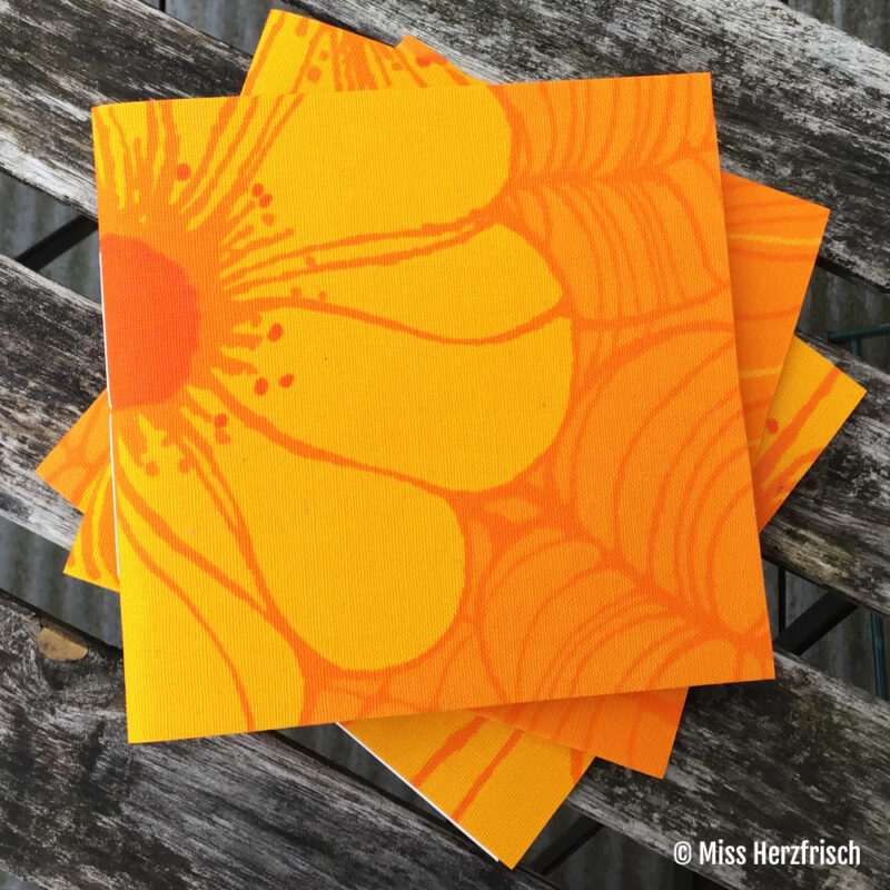 Ein kleines Notizheft, das überall reinpasst – in die Handtasche oder auch in die Jackentasche. Jederzeit bereit für Ideenblitze, Gedankensprünge oder schnelle Notizen. Der Umschlag ist aus 70er Jahre Rollostoff gemacht und die Innenseiten sind aus weißem Zeichenpapier. Jedes Heft ist ein Unikat und sieht deshalb ein wenig anders aus.