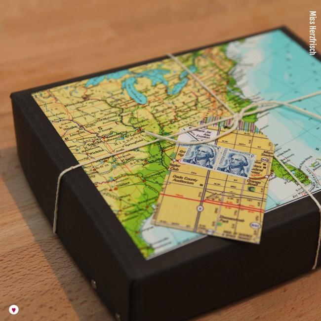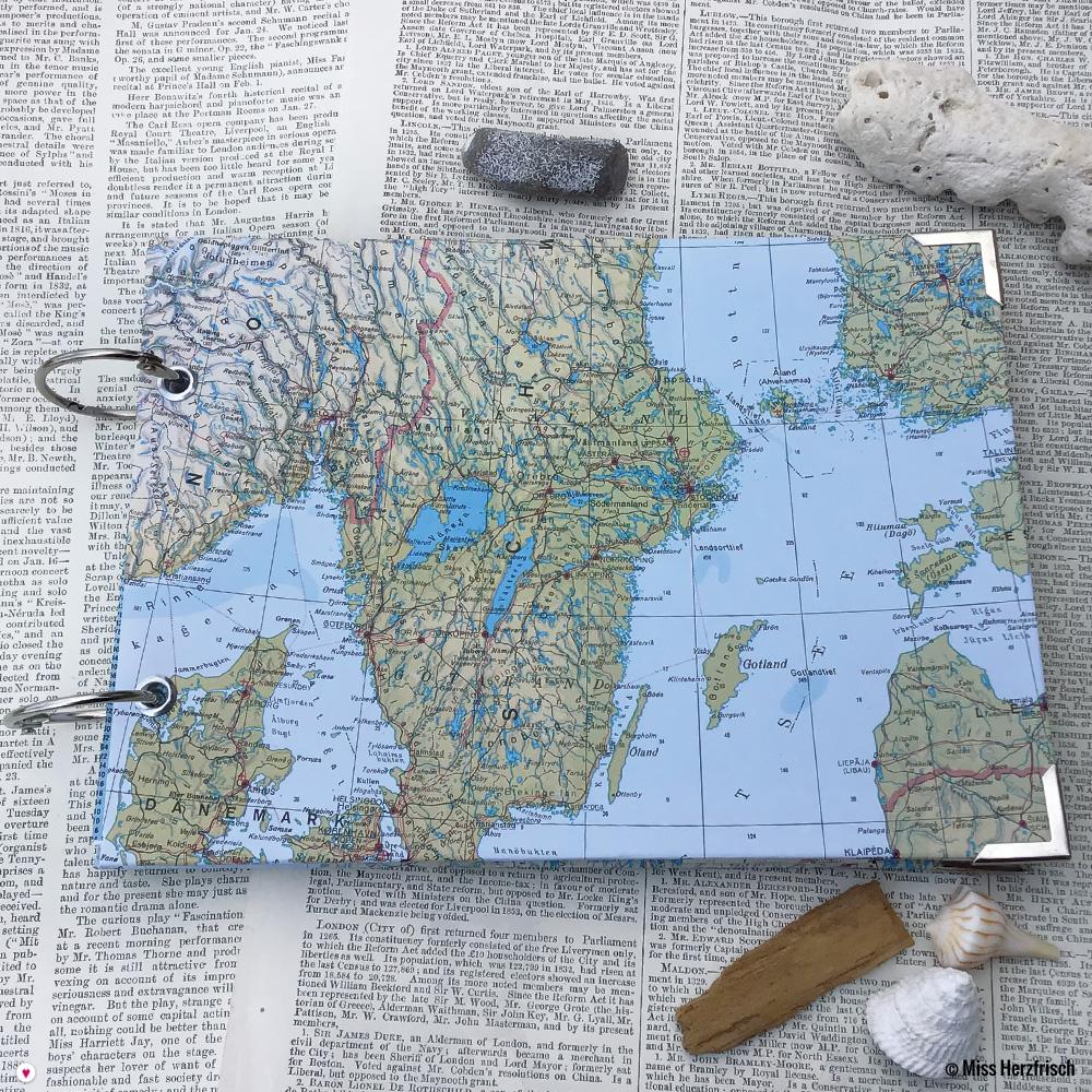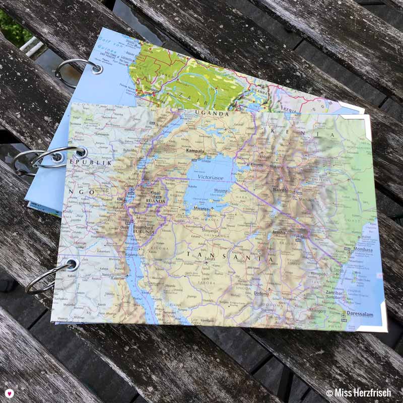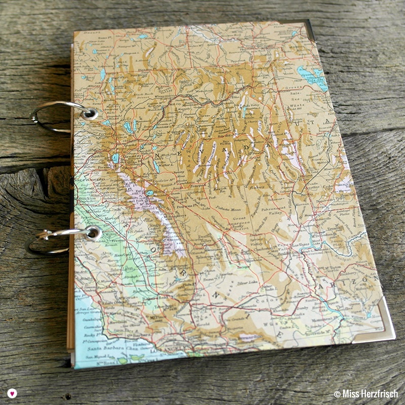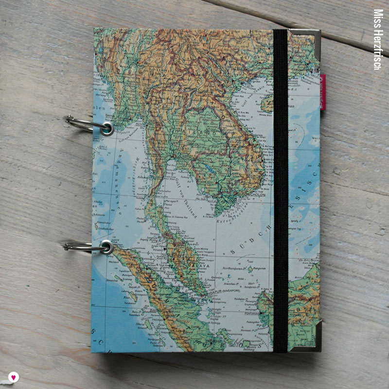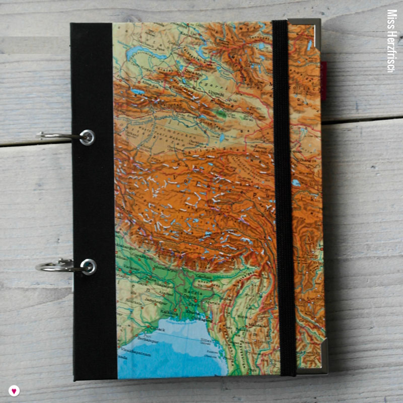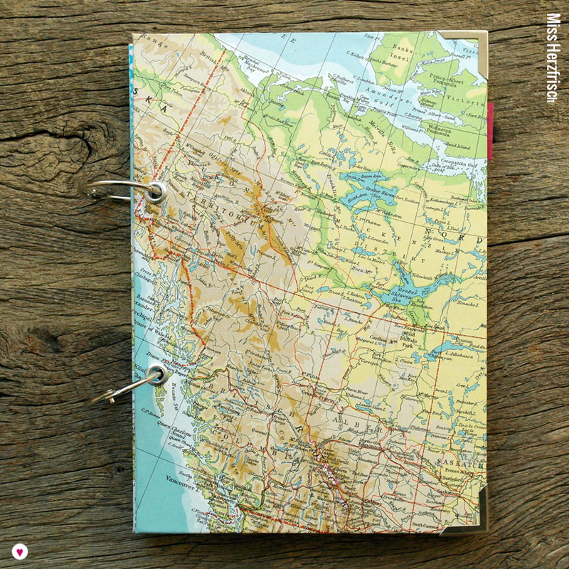- der Umschlag ist ist vorne und hinten mit einer Originalkarte deines Wunschlandes bezogen