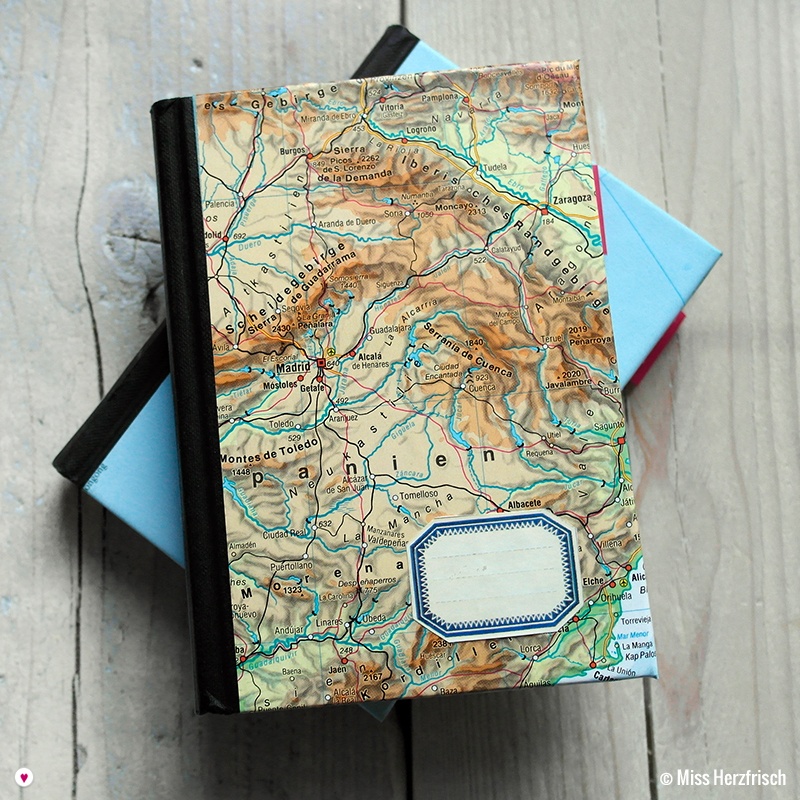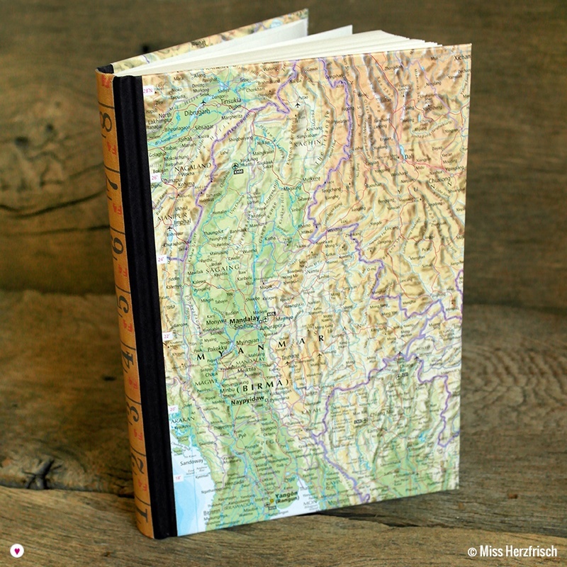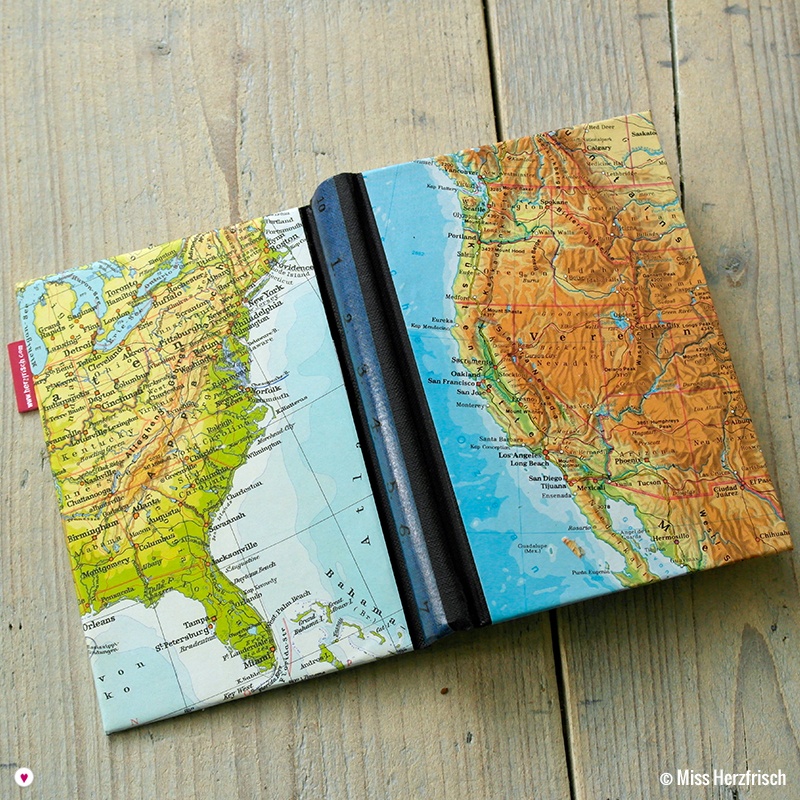 • der Umschlag ist ist vorne und hinten mit einer Originalkarte deines Wunschlandes bezogen