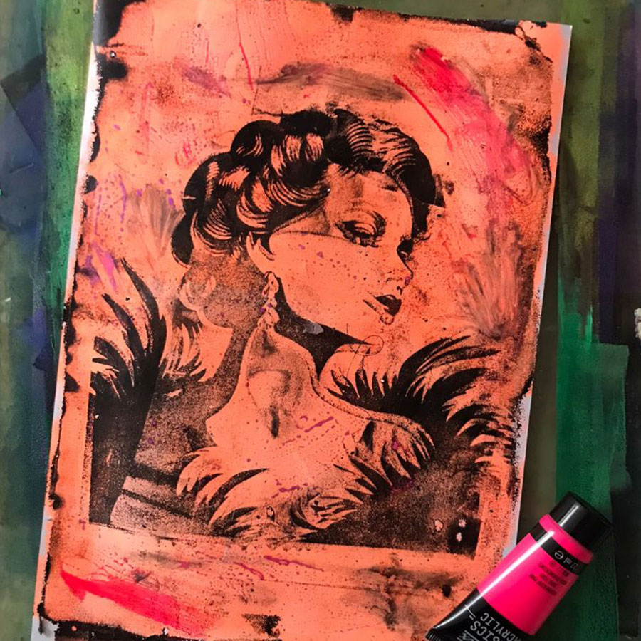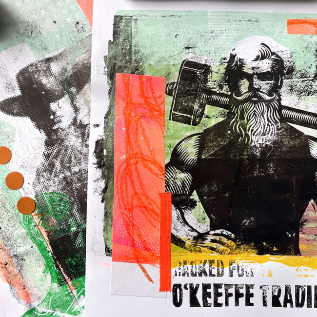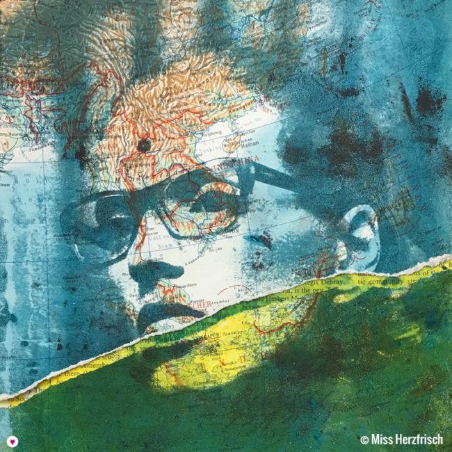Wir experimentieren mit verschiedenen Techniken, erstellen Mixed-Media-Hintergründe und öffnen unseren Stempelkoffer mit großen und kleinen, handgeschnitzten Stempeln im Retro-Look.