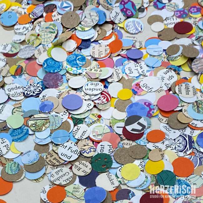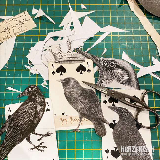 Ob farbenfrohe, verspielte oder nostalgische Collagen – unser Buffet bietet alles, was das kreative Herz begehrt: alte Buchseiten, Notenblätter, Landkarten, Zeitschriften, Briefmarken, Postkarten und jede Menge bunte Schnipsel.