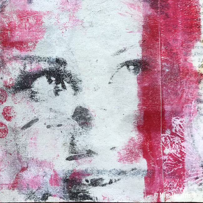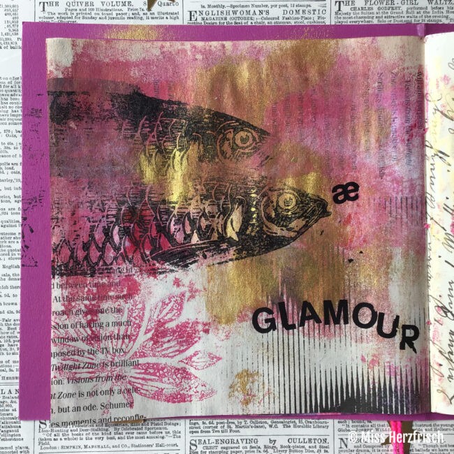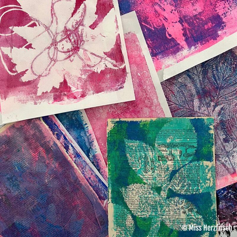 Zusammen tauchen wir ein in die Mixed-Media Welt, nutzen die Gelliplatte, Farben und einen Koffer voller Stempel um das Cover und die Innenseiten zu gestalten.