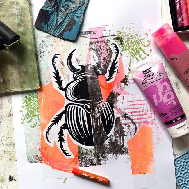 Es gibt aber noch weitere Resist-Techniken, die wir für die Mixed-Media-Hintergründe unserer Bilder anwenden, z. B. mit Ölkreiden. Hast Du schon mit Kugelschreiber-Vorlagen, Zeichenkohle oder Pastellkreiden gedruckt? Geht alles, und wir zeigen, wie.
